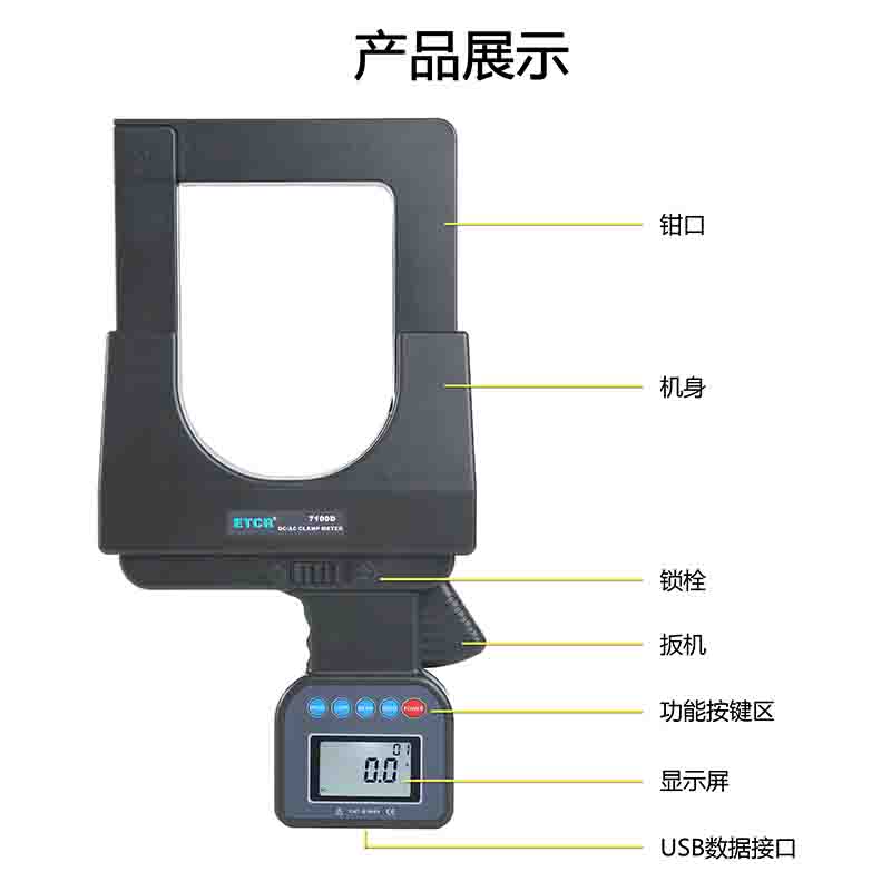 ETCR7100D超大口徑直流/交流鉗形電流表具有峰值保持、數(shù)據(jù)保持、數(shù)據(jù)存儲等功能,配備USB接口和上位機(jī)軟件,可以通過電腦在線實(shí)時監(jiān)控與歷史查詢,動態(tài)顯示,有最大、最小、平均值指示,具有歷史數(shù)據(jù)讀取、保存、打印等功能。