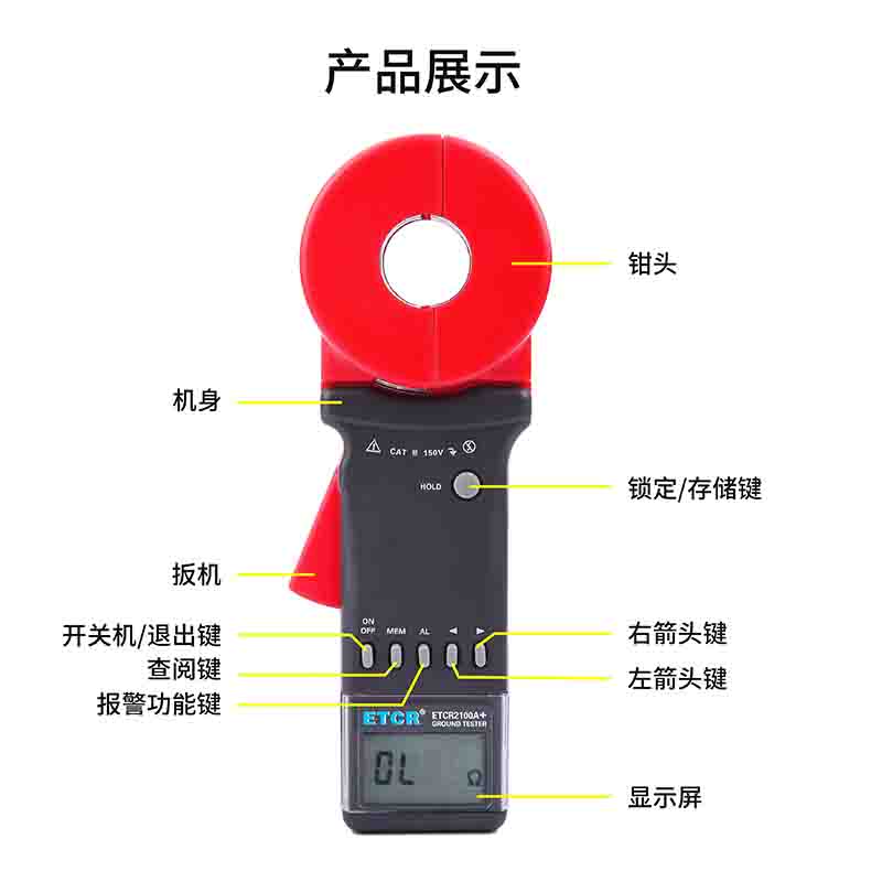 ETCR2100A+鉗形接地電阻儀又稱鉗形接地電阻表、接地電阻儀、回路電阻測試儀、單鉗接地電阻測試儀、環(huán)路電阻測試儀,用于接地電阻、回路電阻測量、接地故障判斷。在測量有回路的接地系統(tǒng)時,不需斷開接地引下線,不需輔助接地極,安全快速、使用簡便。鉗形接地電阻儀廣泛應用于電力、電信、氣象、油田、建筑及工業(yè)電氣設備等的接地電阻測量、回路電阻測量。