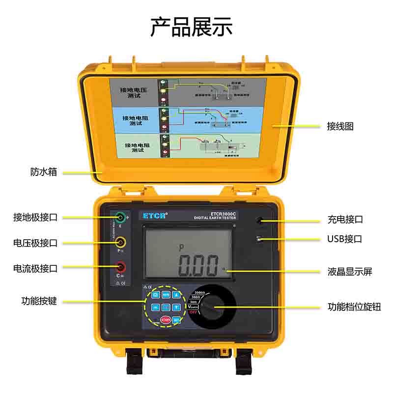 ETCR3000C數字式接地電阻測試儀又稱接地電阻表、數字接地電阻表、地樁式接地電阻儀、接地搖表,用于接地電阻測量、接地電壓測量,儀表采用數字及微處理技術,精密3線或簡易2線法測量接地電阻,其廣泛應用于電力、電信、氣象、建筑、防雷及工業(yè)電氣設備等行業(yè)。