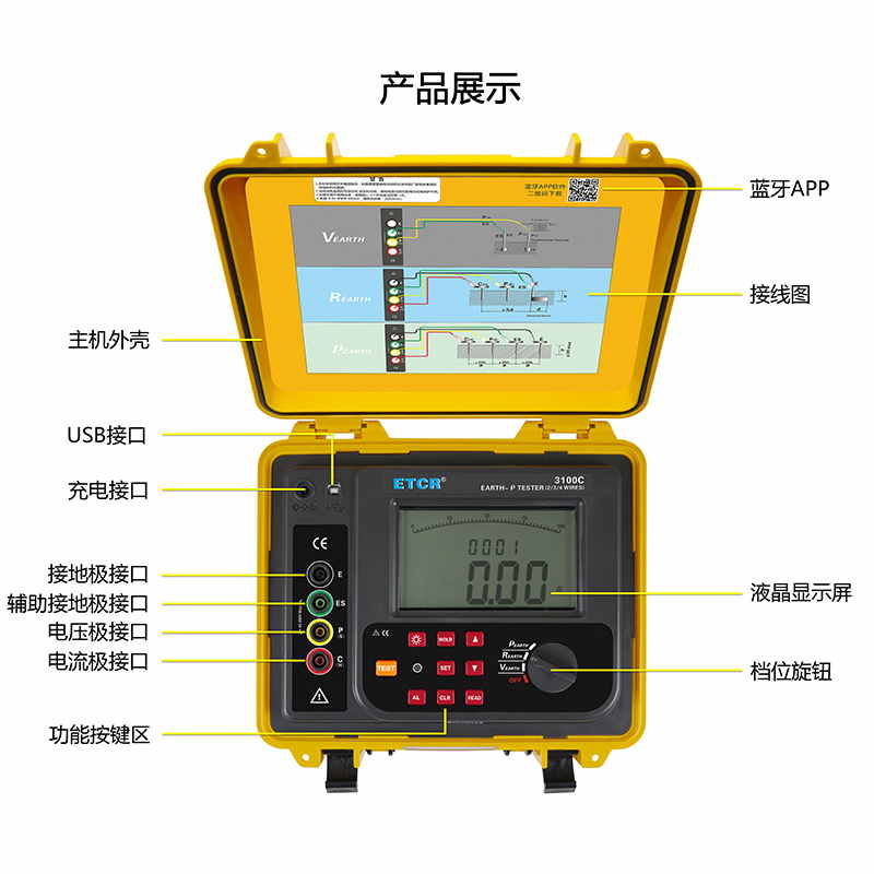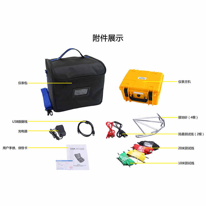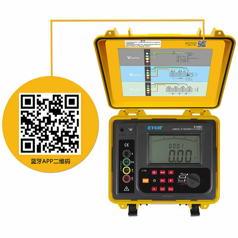 ETCR3100C接地電阻/土壤電阻率測試儀由主機、數(shù)據(jù)上傳軟件、測試線、輔助接地棒、通訊線等組成。儀表外殼采用防水保護箱,防撞、防摔、防水(防護等級IP65)堅固安全耐用,儀表還配有大容量可充電鋰電池組,特別適合在戶外工地使用。主機超大LCD顯示,白屏背光,棒圖指示,一目了然。藍牙通訊功能,數(shù)據(jù)存儲功能存儲300組數(shù)據(jù),通過USB接口數(shù)據(jù)上傳軟件實現(xiàn)歷史查詢與在線實時監(jiān)測功能,動態(tài)顯示,告警指示,具有歷史數(shù)據(jù)讀取、查閱、保存、報表、打印等功能。