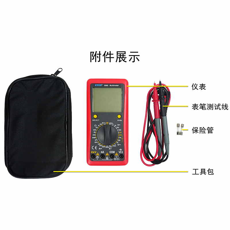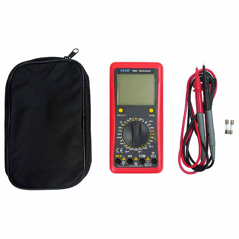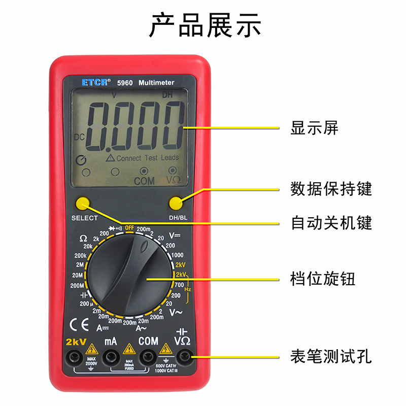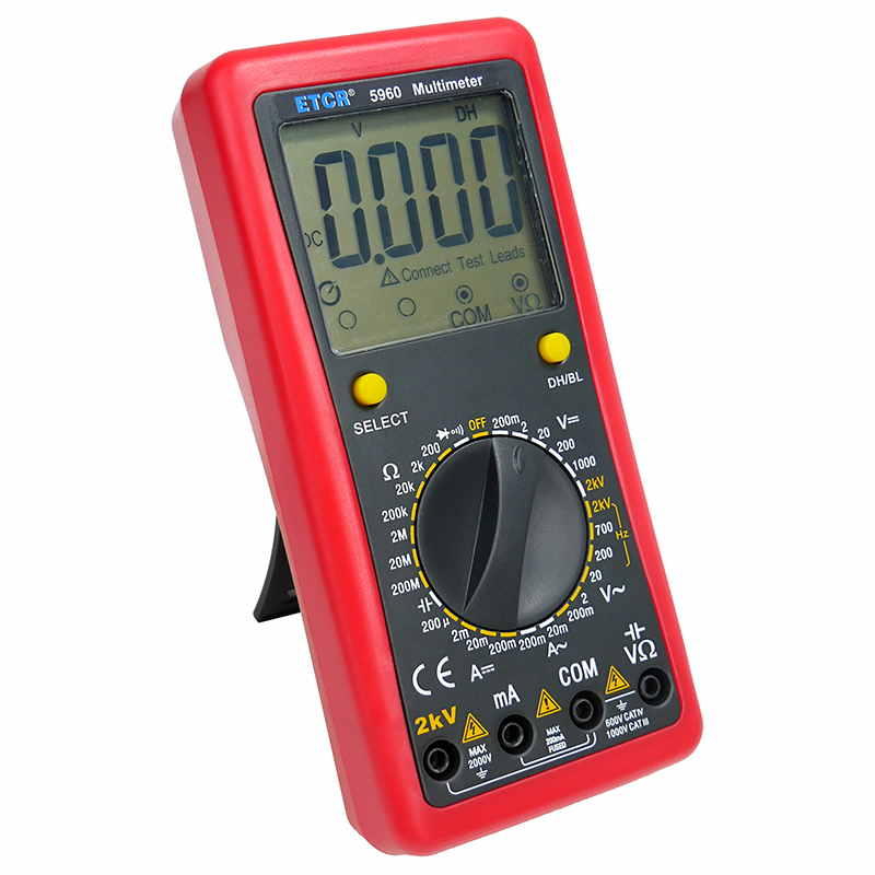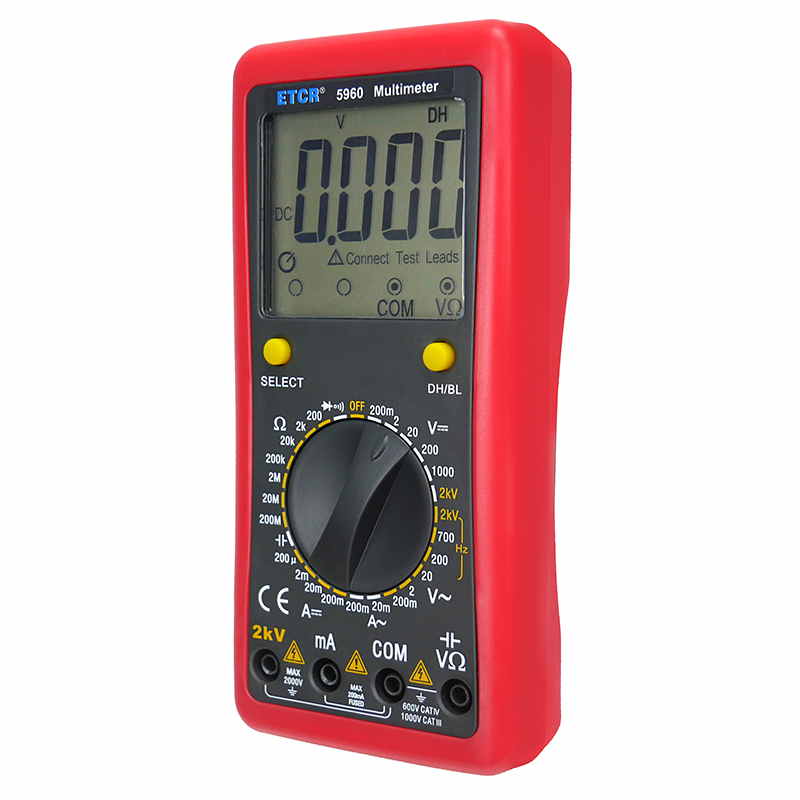 ETCR5960數(shù)字萬(wàn)用表又稱(chēng)數(shù)字萬(wàn)能表、智能萬(wàn)用表,是一種性能穩(wěn)定、用電池供電的高可靠性數(shù)字萬(wàn)用表,它用單片機(jī)管理,全功能有過(guò)載保護(hù)。儀表能顯示各檔表筆和插座應(yīng)插的位置,提示您不要插錯(cuò)位置。該儀表能測(cè)量直流電壓和電流、交流真有效值電壓和電流、電阻、電容、二極管正向壓降、電路通斷等。測(cè)量準(zhǔn)確、性能穩(wěn)定、安全可靠,是您理想的測(cè)試維修工具!