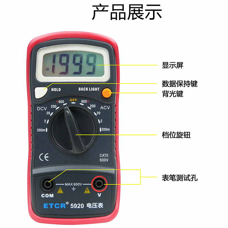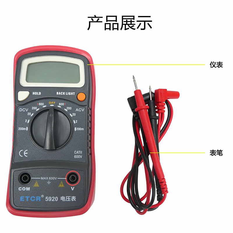 ETCR5920數(shù)字電壓表設(shè)有背光源,方便用戶在黑暗的場所讀出測量值。