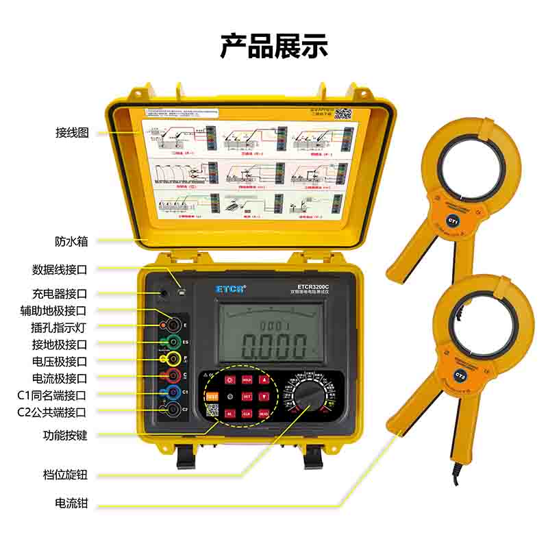 ETCR3200C雙鉗接地電阻測試儀,由主機(jī)、電流鉗(雙鉗)、數(shù)據(jù)軟件、測試線、輔助接地棒、通訊線等組成。儀表采用大口徑電流鉗設(shè)計(jì),可應(yīng)對各種場合的測試需求,可測量大尺寸接地引下線的接地電阻值,主機(jī)超大LCD顯示,具有背光、棒圖指示,一目了然。儀表具有支持安卓系統(tǒng)的藍(lán)牙通訊功能,安裝APP后可在移動終端進(jìn)行測試或讀取測試記錄,給你帶來全新體驗(yàn)。儀表具有存儲功能,時鐘功能,自動存儲含有日期時間的測試結(jié)果2000組。通過USB接口數(shù)據(jù)軟件可以實(shí)現(xiàn)歷史數(shù)據(jù)讀取、查閱、保存、報(bào)表、打印等功能。