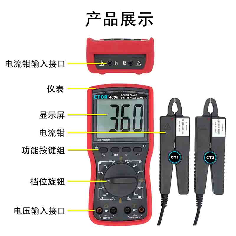 ETCR4020大口徑雙鉗數(shù)字相位伏安表Φ40mm0~360°0.00V~600V0mA~600A0.0W~360kW
