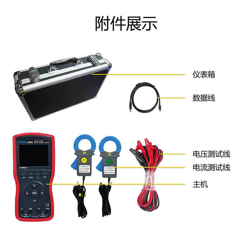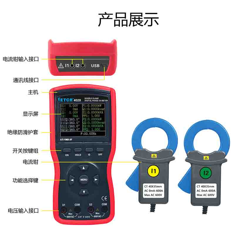 ETCR4020大口徑雙鉗數(shù)字相位伏安表Φ40mm0~360°0.00V~600V0mA~600A0.0W~360kW