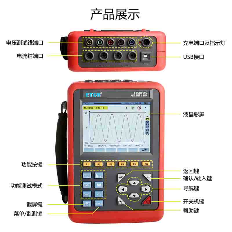 3、四通道電流、電壓測量,同時捕捉和記錄電量參數(shù)、波形,4、超大液晶彩屏顯示,高分辨率。