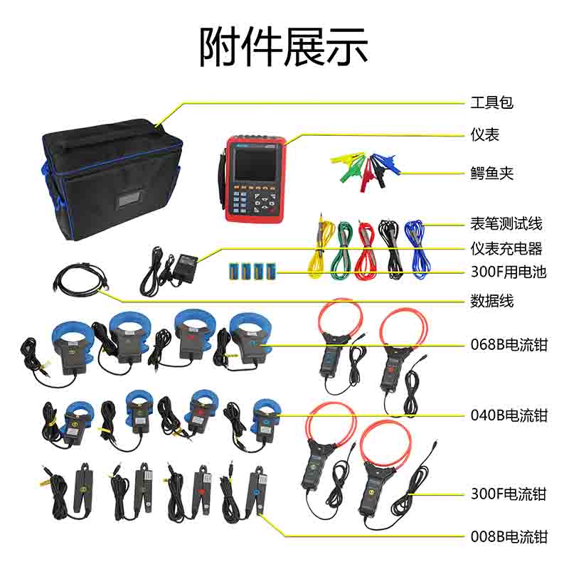 | 電流鉗規(guī)格(選配) | 008B尖小形電流鉗:Φ8mm 040B圓口形電流鉗:35mm×40mm; 068B圓口形電流鉗:68mm×68mm 300F柔性線圈電流傳感器:Φ300mm |