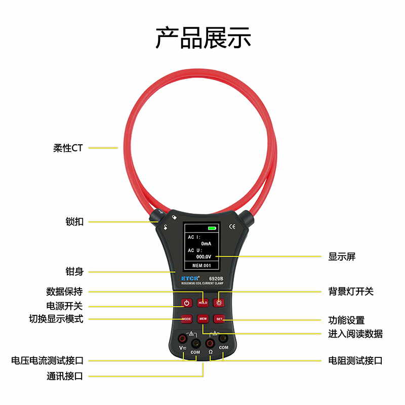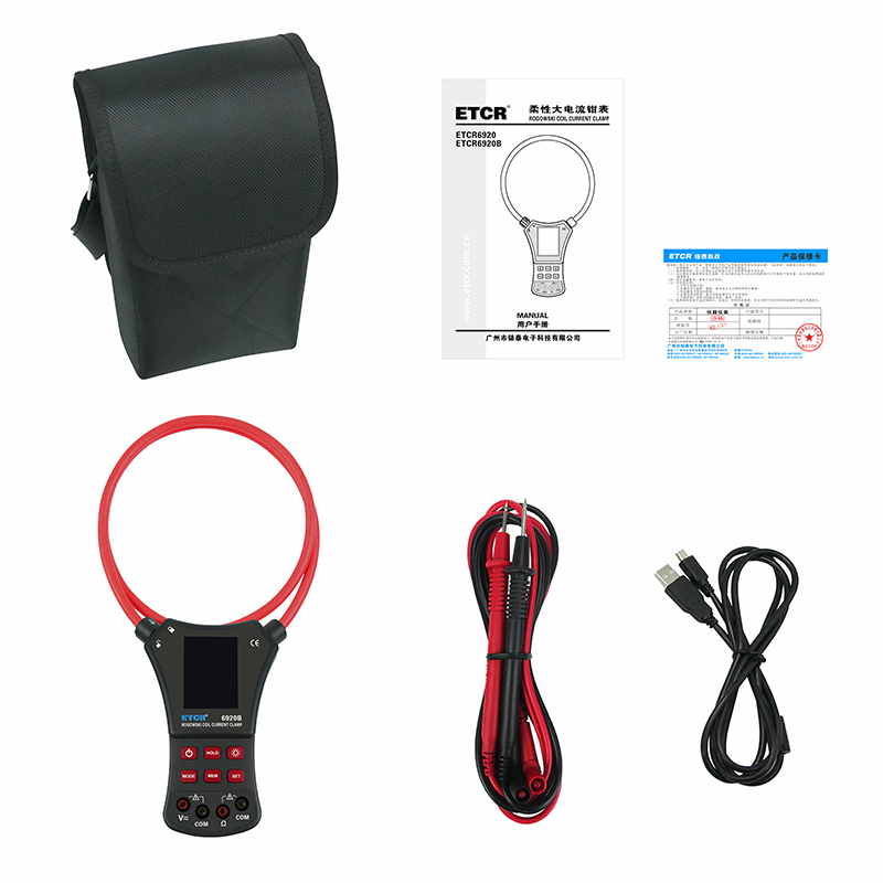 ETCR6920B柔性電流鉗表又名柔性線圈鉗表、超大電流鉗表、羅氏線圈電流鉗表、洛氏線圈電流鉗表,用于交流電流測試、電壓測試、電阻測試、通斷測試。柔性線圈無任何裸露金屬導(dǎo)體,體積小、重量輕、柔軟靈活,特別適合大尺寸導(dǎo)體、狹窄環(huán)境和排線密集的場所,可用于信號嚴(yán)重畸變的工業(yè)環(huán)境電流測試。廣泛適用于電力、通信、氣象、鐵路、油田、建筑、計量、科研教學(xué)單位、工礦企業(yè)等領(lǐng)域。