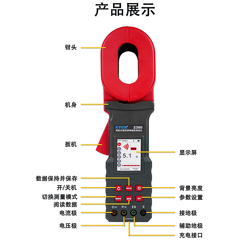 ETCR2300地樁式鉗形接地電阻表又稱地樁式鉗形接地電阻表、地樁式鉗形表,用于現(xiàn)場測量接地電阻、土壤電阻率、接地電流、接地電壓。儀表具有鉗表法、二線法、三線法、四線法、選擇法等各種測量方法,儀表導(dǎo)入FFT(快速傅立葉變換)技術(shù)、AFC(自動頻率控制)技術(shù),具有獨特的抗干擾能力和環(huán)境適應(yīng)能力,重復(fù)測試一致性強,確保測量的高精度、高穩(wěn)定性和高可靠性。