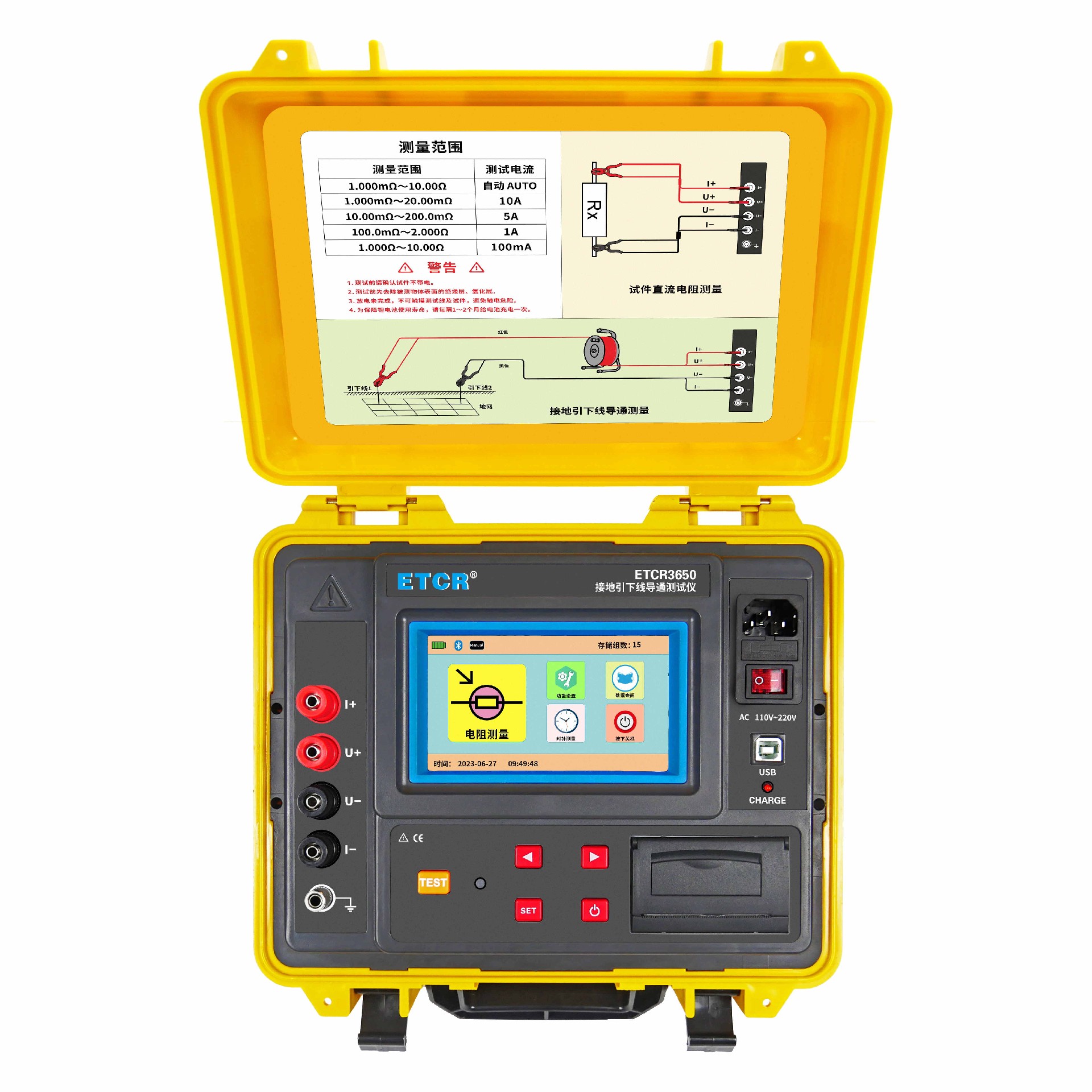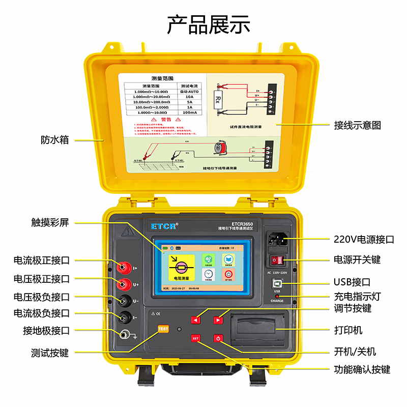 ETCR3650接地引下線導(dǎo)通測(cè)試儀專門用于接地裝置的電氣完整性測(cè)試,其各項(xiàng)技術(shù)指標(biāo)均達(dá)到或優(yōu)于相關(guān)標(biāo)準(zhǔn)要求。儀器由主機(jī)、測(cè)試線等組成,儀表采用微處理機(jī)技術(shù),精密四線法測(cè)試,準(zhǔn)確可靠。儀表有AC220V及大容量鋰電池兩種供電模式,自動(dòng)測(cè)量及手動(dòng)測(cè)量?jī)煞N測(cè)量模式,儀表采用5寸全彩高清觸摸屏,帶背光調(diào)節(jié)功能,強(qiáng)光下清晰可見(jiàn)。儀表外殼采用防水保護(hù)箱,防撞、防摔、防水堅(jiān)固安全耐用,儀表帶有內(nèi)置打印機(jī)、藍(lán)牙通訊,USB接口。儀器操作簡(jiǎn)單方便、精度高、測(cè)試速度快,復(fù)測(cè)性好、讀數(shù)直觀,是符合規(guī)程要求的理想的專用儀器,大大方便了試驗(yàn)項(xiàng)目的開(kāi)展,提高了工作效率。