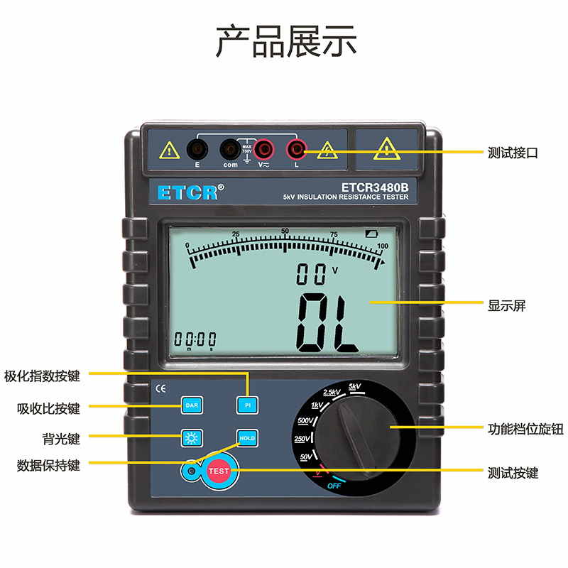 ETCR3480B絕緣電阻表50V、250V、500V、1000V、2500V、5000V0.1MΩ~1000GΩ2mA MAXAC/DC:0V~750V