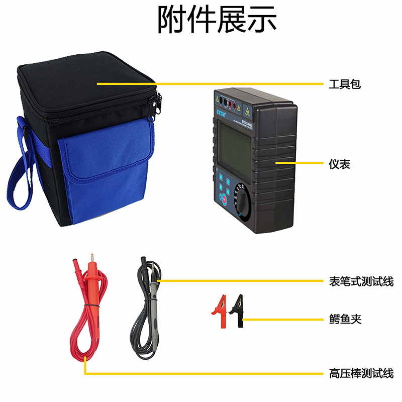 1、6檔輸出電壓50V、250V、500V、1000V、2500V、5000V,寬量程0.1MΩ~1000GΩ,最大短路電流2mA。