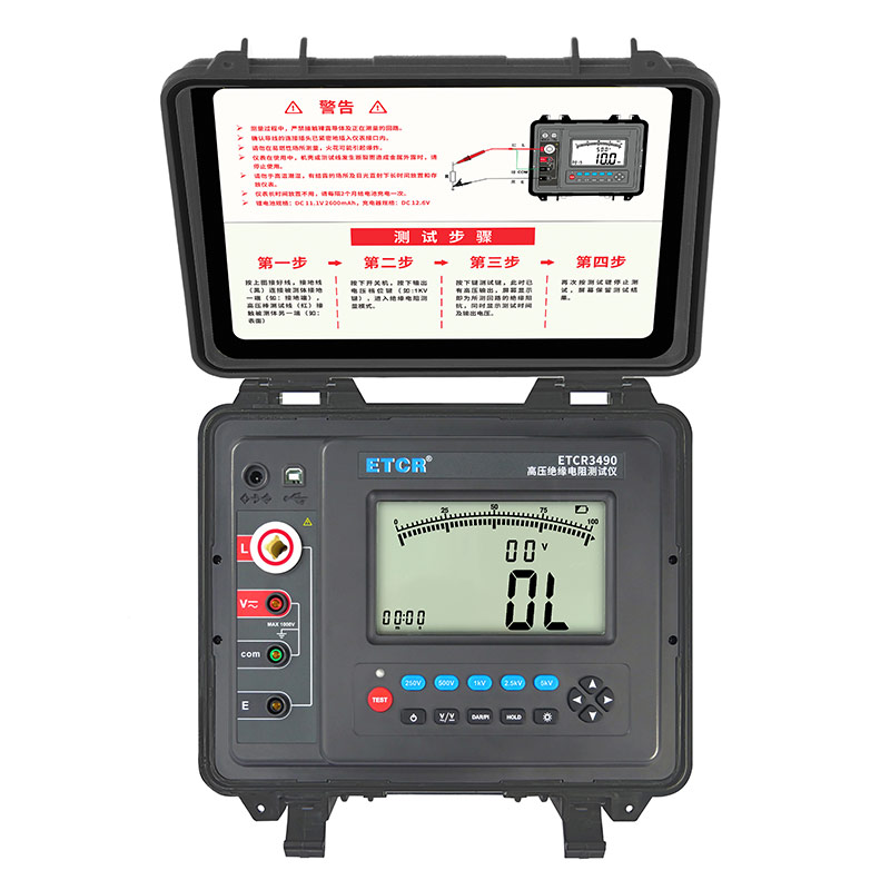 ETCR3490系列高壓絕緣電阻測試儀又名兆歐表、絕緣電阻測試儀等,用于絕緣電阻的測試。本儀表是一款高性能數(shù)字式儀表,具有LCD大屏幕帶背光顯示、數(shù)據(jù)保持、自動(dòng)放電、自動(dòng)關(guān)機(jī)等功能。儀表具有測試計(jì)時(shí),電壓監(jiān)測功能,回路電壓大于36V時(shí),儀表將禁止測試以保護(hù)被測物及人員安全。儀表功能操作簡易,絕緣電阻值,測試時(shí)間,輸出電壓同屏顯示,同時(shí)還具備吸收比、極化指數(shù)測試、交流電壓、直流電壓測試功能。
