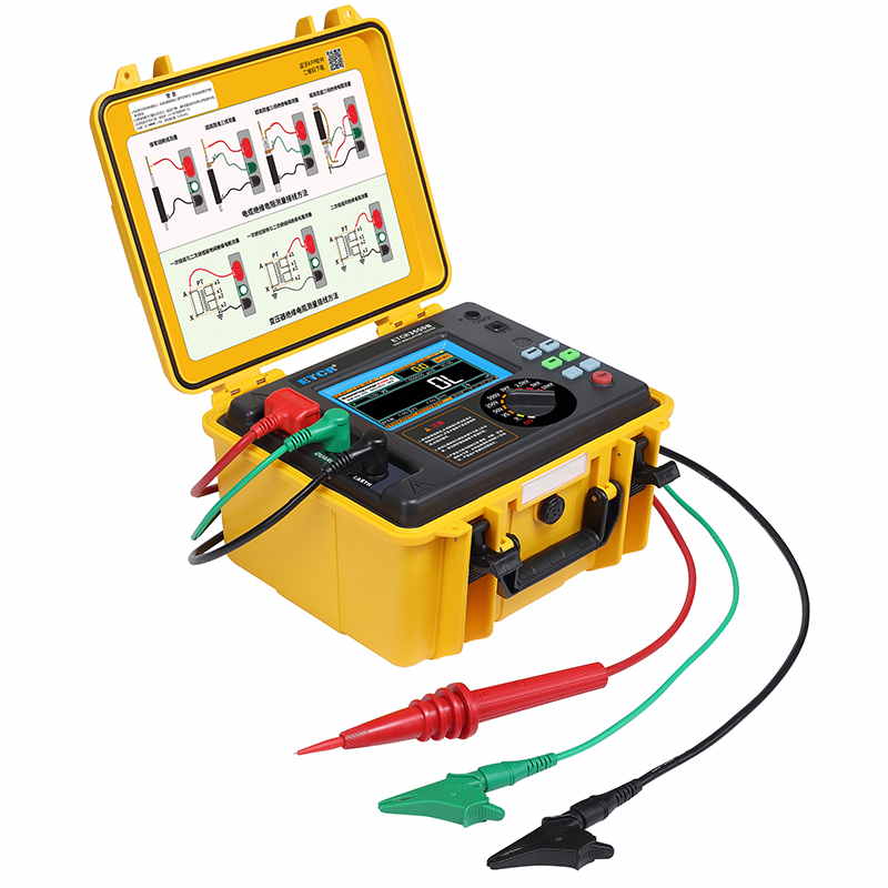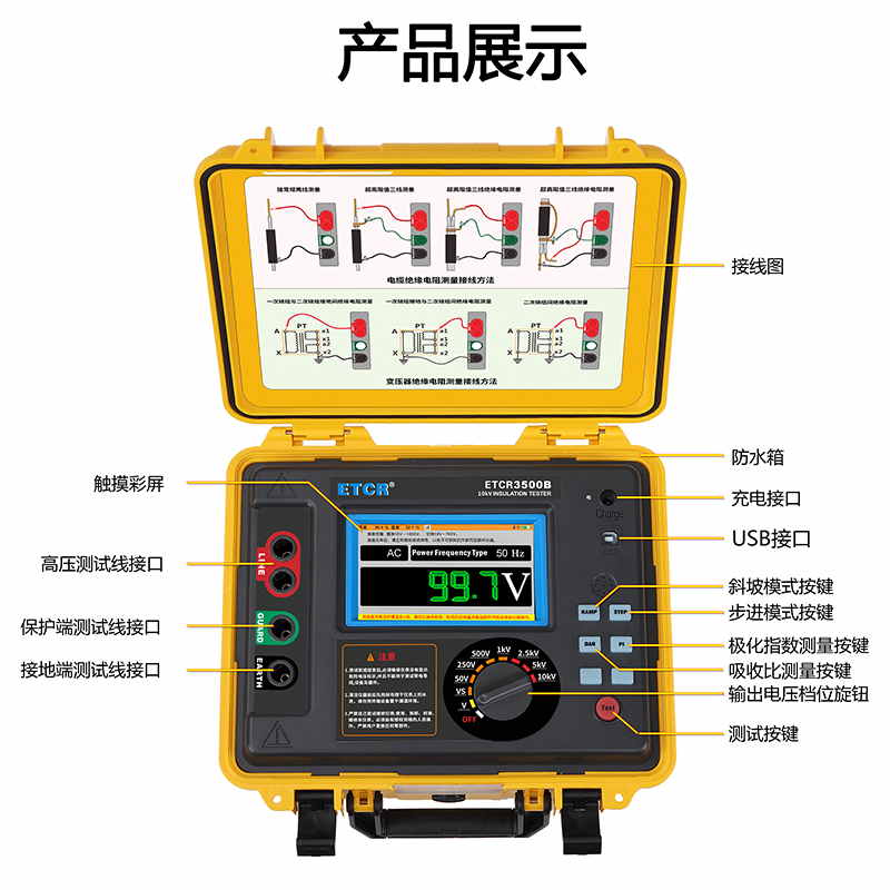 ETCR3500B高壓絕緣電阻測(cè)試儀又稱高壓兆歐表、高壓絕緣電阻表,擁有完善的各種絕緣電阻指標(biāo)測(cè)試功能、自設(shè)測(cè)試電壓功能、良好的抗干擾能力,在變電站等有強(qiáng)感應(yīng)電環(huán)境下、以及在分布電容較大的使用場(chǎng)景下具有明顯優(yōu)勢(shì)。儀表采用真彩觸摸屏,所有測(cè)試數(shù)據(jù)及電池電量同屏顯示一目了然,旋鈕開(kāi)關(guān)和按鍵組合使得操作非常簡(jiǎn)單。用戶無(wú)需費(fèi)力記憶操作方法,點(diǎn)擊屏幕的“HELP”即可彈出操作方法,有效指引用戶操作儀表。產(chǎn)品適用于大容量、高壓、強(qiáng)感應(yīng)電環(huán)境下電氣設(shè)備、輸電線路等大型設(shè)備的絕緣電阻測(cè)試。是電力、電信、氣象、機(jī)房、油田、機(jī)電安裝和維修以及工礦企業(yè)供電部門常用而必不可少的儀表。