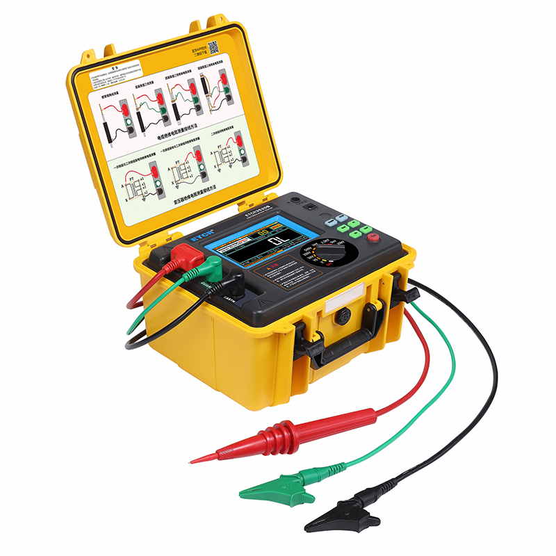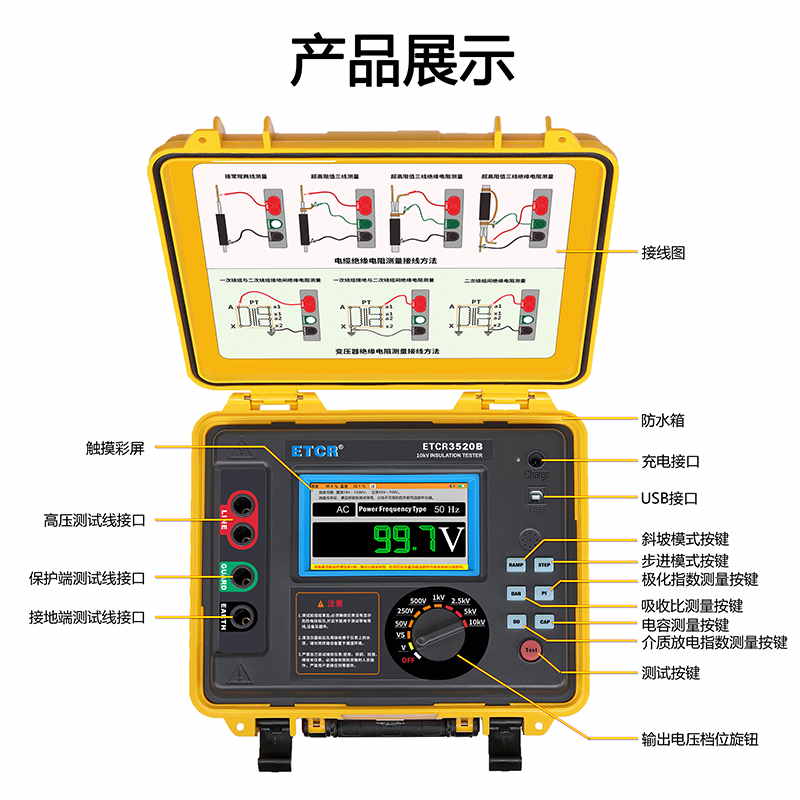 ETCR3520B高壓絕緣電阻測(cè)試儀又稱高壓兆歐表、高壓絕緣電阻表,儀表?yè)碛型晟频母鞣N絕緣電阻指標(biāo)測(cè)試功能、自設(shè)測(cè)試電壓功能、良好的抗干擾能力,在變電站等有強(qiáng)感應(yīng)電環(huán)境下、以及在分布電容較大的使用場(chǎng)景下具有明顯優(yōu)勢(shì)。儀表采用真彩觸摸屏,所有測(cè)試數(shù)據(jù)及電池電量同屏顯示一目了然,旋鈕開關(guān)和按鍵組合使得操作非常簡(jiǎn)單。用戶無(wú)需費(fèi)力記憶操作方法,點(diǎn)擊屏幕的“HELP”即可彈出操作方法,有效指引用戶操作儀表。產(chǎn)品適用于大容量、高壓、強(qiáng)感應(yīng)電環(huán)境下電氣設(shè)備、輸電線路等大型設(shè)備的絕緣電阻測(cè)試。是電力、電信、氣象、機(jī)房、油田、機(jī)電安裝和維修以及工礦企業(yè)供電部門常用而必不可少的儀表。