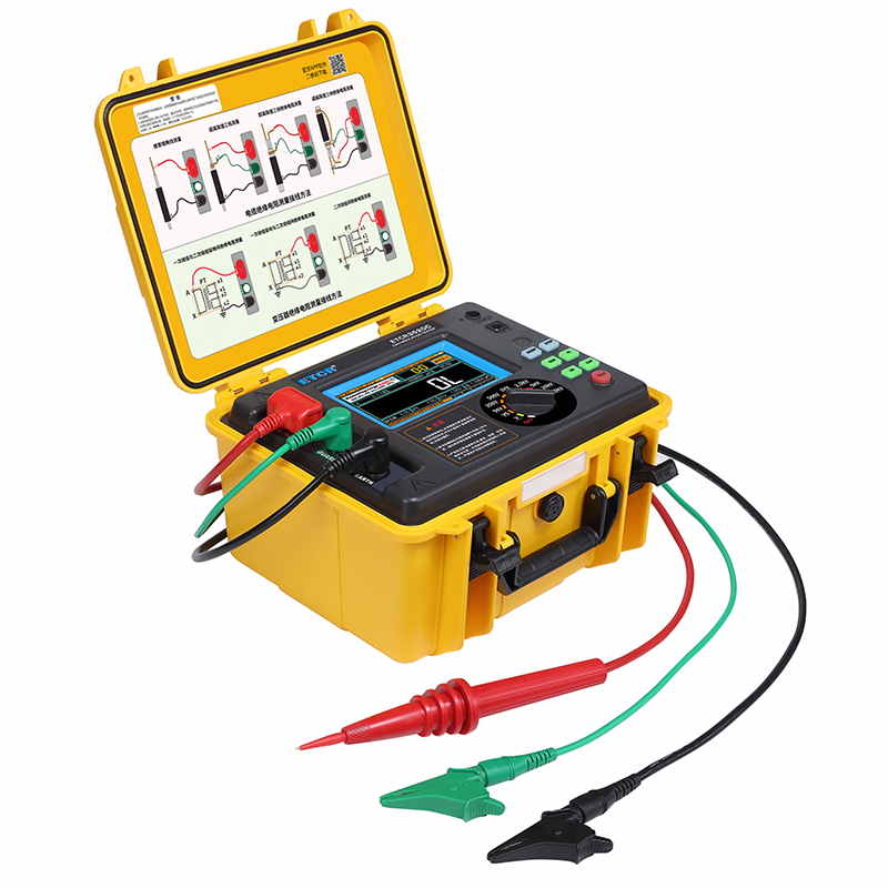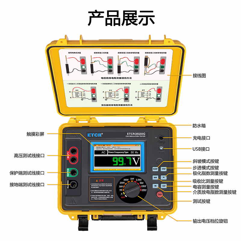 ETCR3520C高壓絕緣電阻測(cè)試儀又稱(chēng)高壓兆歐表、高壓絕緣電阻表,儀表?yè)碛型晟频母鞣N絕緣電阻指標(biāo)測(cè)試功能、自設(shè)測(cè)試電壓功能、良好的抗干擾能力,在變電站等有強(qiáng)感應(yīng)電環(huán)境下、以及在分布電容較大的使用場(chǎng)景下具有明顯優(yōu)勢(shì)。儀表采用真彩觸摸屏,所有測(cè)試數(shù)據(jù)及電池電量同屏顯示一目了然,旋鈕開(kāi)關(guān)和按鍵組合使得操作非常簡(jiǎn)單。用戶(hù)無(wú)需費(fèi)力記憶操作方法,點(diǎn)擊屏幕的“HELP”即可彈出操作方法,有效指引用戶(hù)操作儀表。產(chǎn)品適用于大容量、高壓、強(qiáng)感應(yīng)電環(huán)境下電氣設(shè)備、輸電線(xiàn)路等大型設(shè)備的絕緣電阻測(cè)試。是電力、電信、氣象、機(jī)房、油田、機(jī)電安裝和維修以及工礦企業(yè)供電部門(mén)常用而必不可少的儀表。