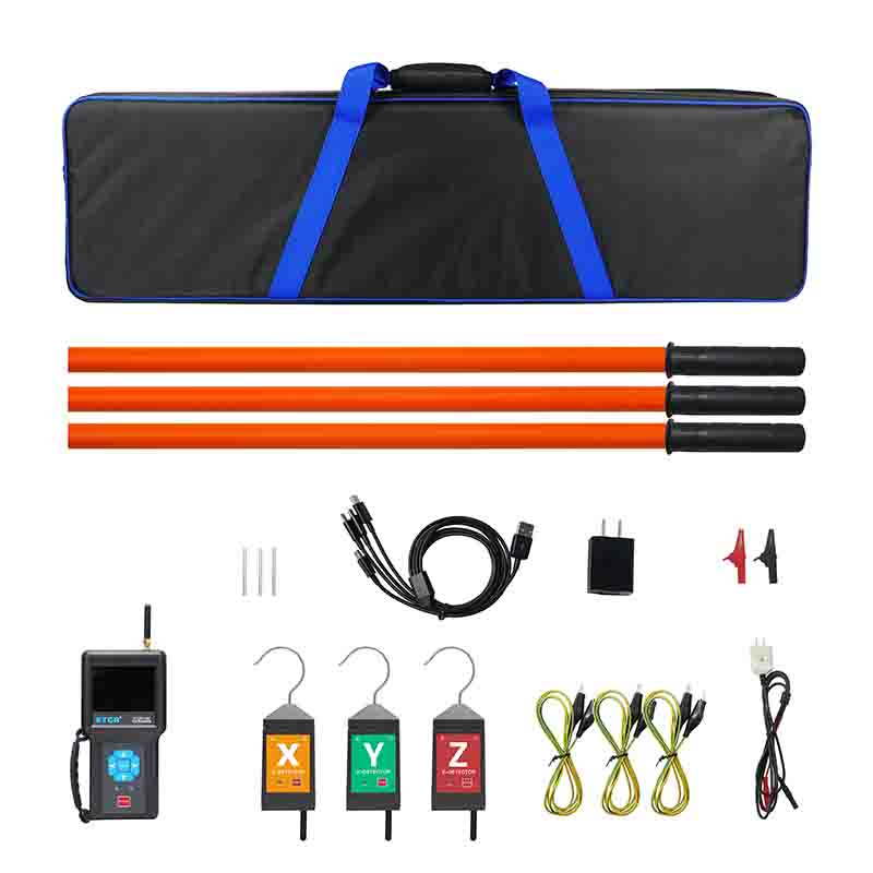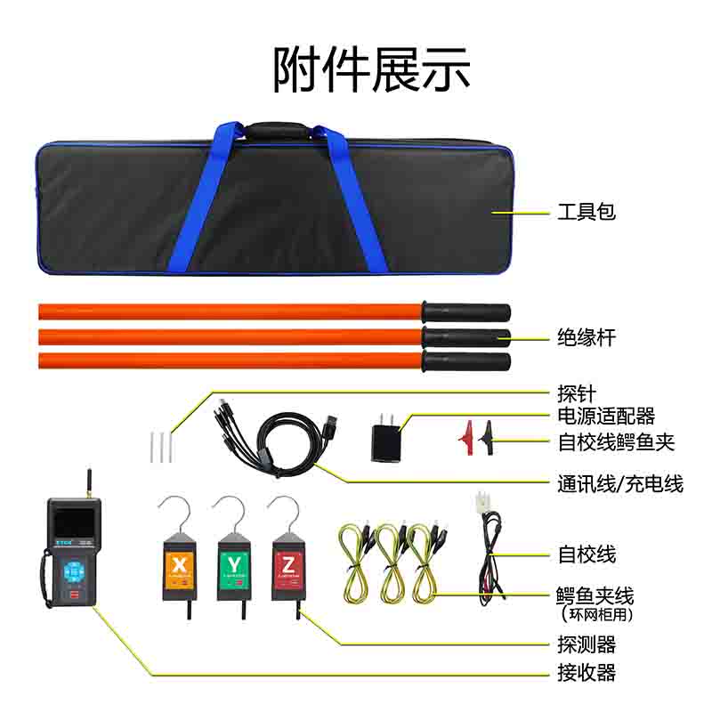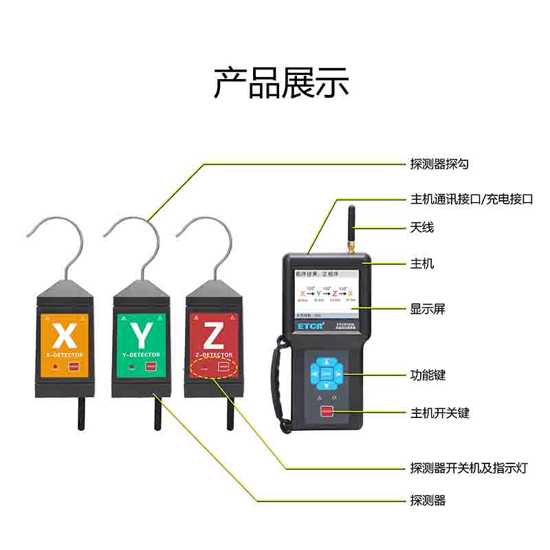 ETCR1050無線高壓相序測試儀由主機(jī)、3個(gè)探測器、伸縮絕緣桿、數(shù)據(jù)上傳軟件、USB通訊線等組成,主機(jī)采用3.5寸真彩液晶屏,可以同屏顯示相位、頻率、相序及核相結(jié)果,向量圖指示、相位指示清晰直觀,具有“X信號正常、Y信號正常、Z信號正常、正相序、反相序、同相、異相”等語音提示功能,使測試更簡單輕松。儀表有USB通信接口,存儲數(shù)據(jù)可上傳電腦進(jìn)行歷史數(shù)據(jù)讀取、查閱、保存、打印。
