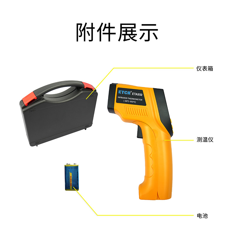 | ETA950非接觸式紅外測溫儀 | -50℃~950℃ | 0.1℃ | 8um~14um | 9V 碳性或堿性電池 |