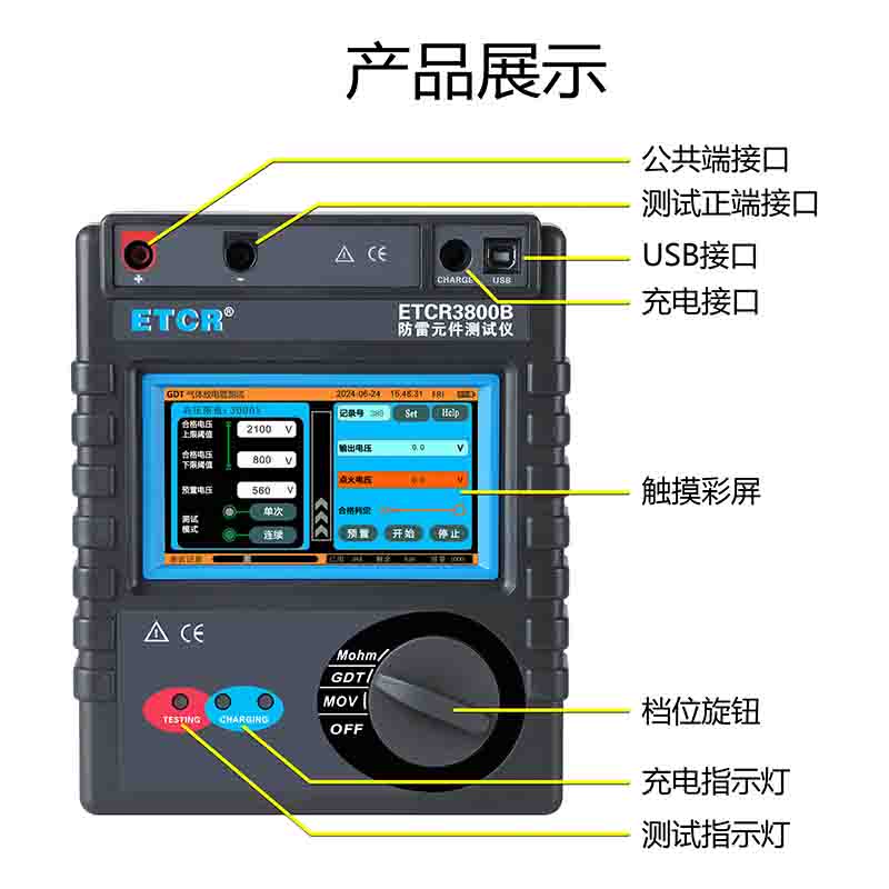 ETCR3800B智能型防雷元件測試儀又稱防雷元件測試表、SPD現(xiàn)場測試儀、壓敏電阻測試儀、浪涌保護(hù)器測試儀,用于測量各種壓敏電阻(MOV)、氣體放電管(GDT)、浪涌保護(hù)器(SPD)性能參數(shù)測試,還具有絕緣電阻、吸收比、極化指數(shù)測試功能。儀表具有獨(dú)特的高壓短路保護(hù)、過流保護(hù)功能,專業(yè)級的參數(shù)設(shè)置功能、高壓限值設(shè)定、升壓速度設(shè)定、合格范圍設(shè)定、合格判斷篩選、自動量程調(diào)節(jié)等功能。還具有單件測試模式、連續(xù)測試模式功能,特別適合批量元件測試。儀器廣泛用于避雷器、防雷器、浪涌保護(hù)器、壓敏電阻、金屬陶瓷放電管、真空避雷管等過壓防護(hù)元件性能參數(shù)的測試。是氣象防雷、電力、通信、機(jī)電安裝和維修、防雷元件生產(chǎn)廠家、以及工業(yè)企業(yè)部門常用必備的儀表。