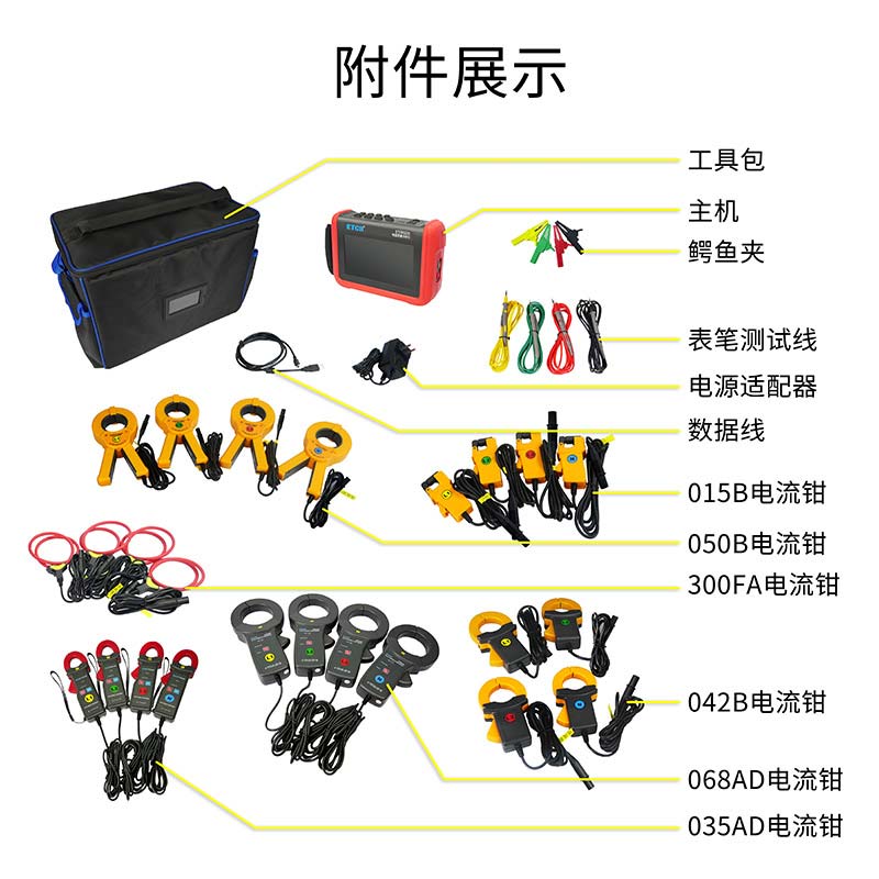 鉗口尺寸 | 015B電流鉗:17mm×18mm;(選配) 042B電流鉗:35mm×40mm;(選配) 050B電流鉗:Φ50mm;(選配) 300FA電流鉗:Φ300mm;(選配) 035AD電流鉗:φ30mm×35mm(選配) 068AD直流電流鉗:Ф68mm(選配) |