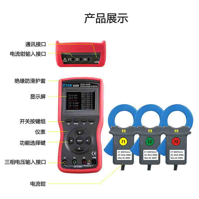 ETCR4320大口徑三相數(shù)字相位伏安表Φ40mm0~360°0.00V~600V0mA~600A0.0W~360kW--