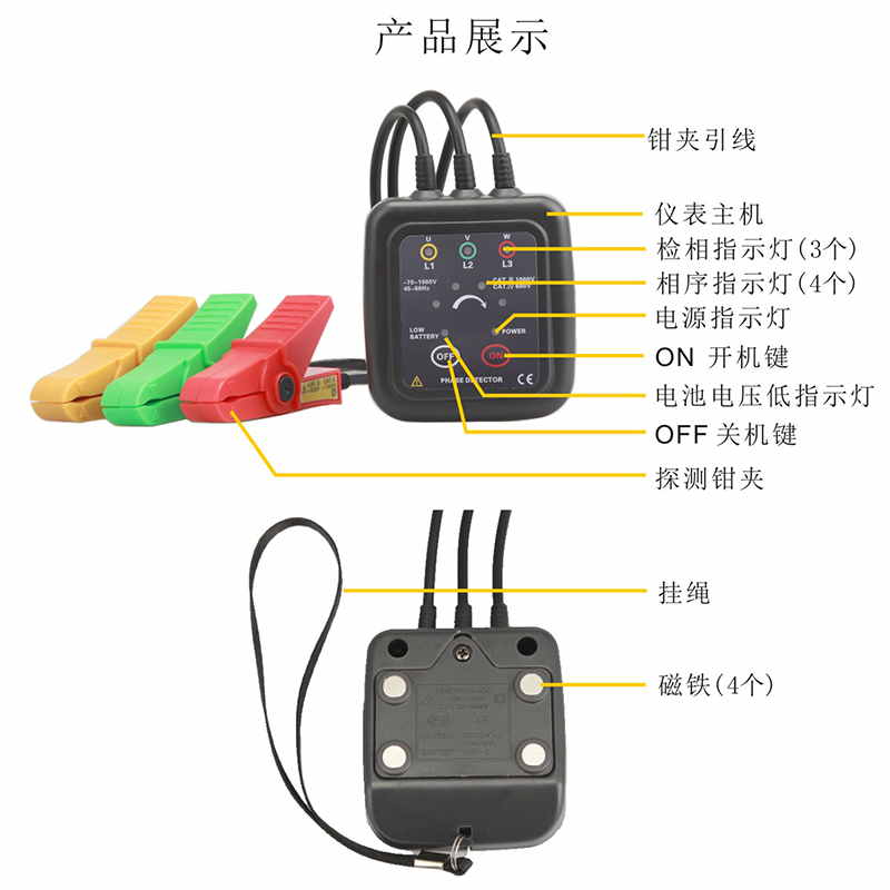 用于相序檢測(cè)(正相、逆相、缺相)、活線檢查、簡(jiǎn)易檢電、火線識(shí)別、缺相判斷、斷線位置查找、線路檢修
