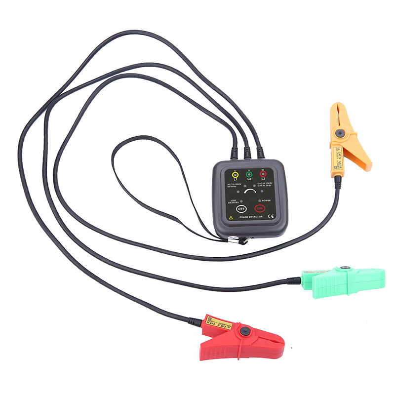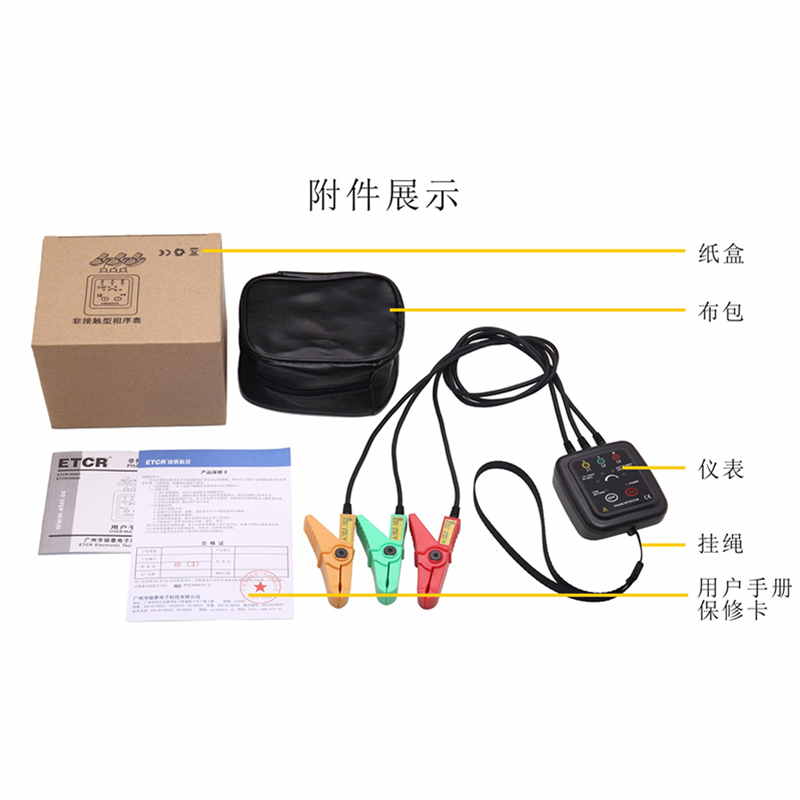 1、采用鉗形非接觸感應(yīng)式測(cè)量,不用剝開電纜線外皮,無(wú)需接觸高壓裸露火線,直接將三個(gè)超感應(yīng)高絕緣鉗夾分別夾住三相火線的絕緣外皮即可檢測(cè)相序。