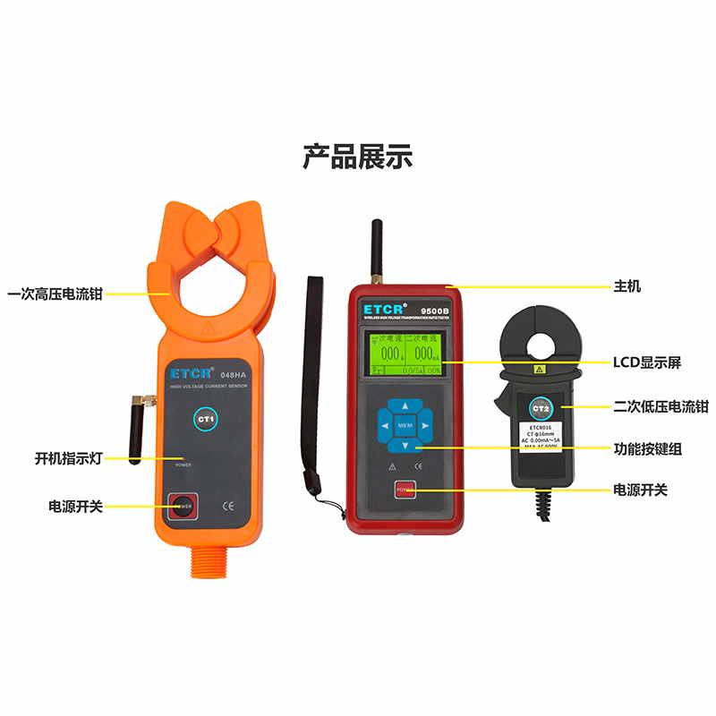 ETCR9500B無(wú)線高壓CT變比測(cè)試儀又稱互感器電流變比測(cè)試儀、互感器比差測(cè)試儀、電流互感器變比測(cè)試儀,用于35kV以下電流互感器的一次電流、二次電流大小、變比,相別、極性判斷。廣泛應(yīng)用于變電站﹑發(fā)電廠﹑電力稽查部門、工礦企業(yè)以及檢測(cè)站﹑電工維修部門進(jìn)行電流檢測(cè)、反竊電及野外電工作業(yè)等。